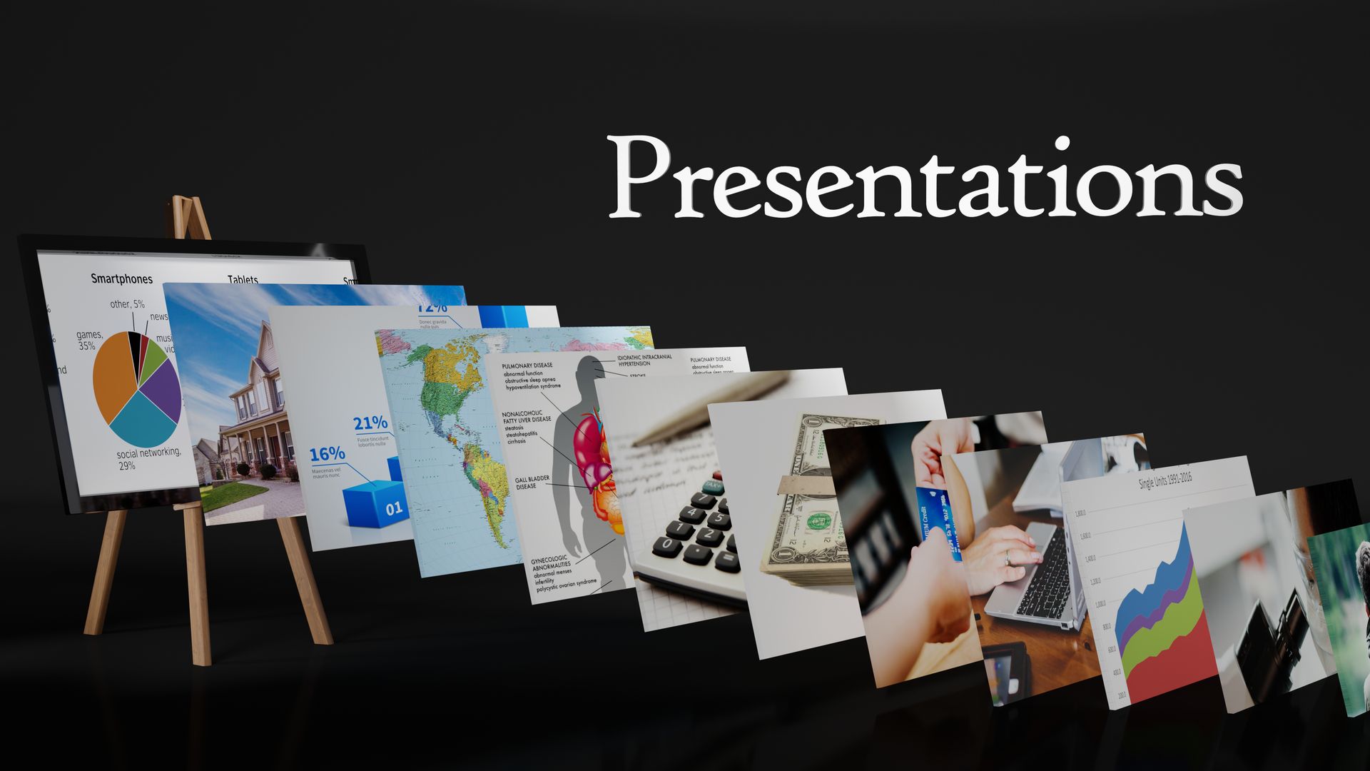 We offer presentations of all sizes and formats. Slideshows, graphics, charts, diagrams, flow charts, Webinar and Zoom call slides, etc.